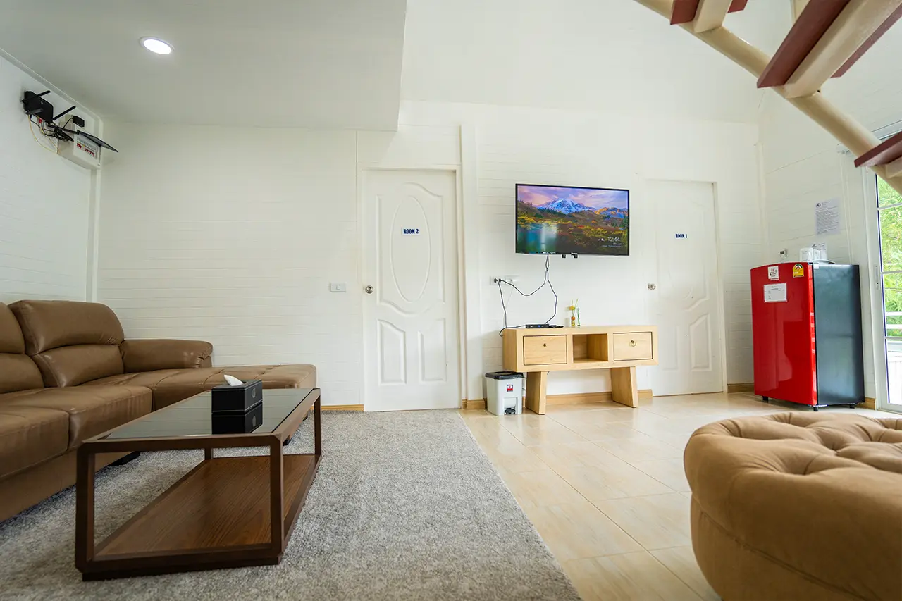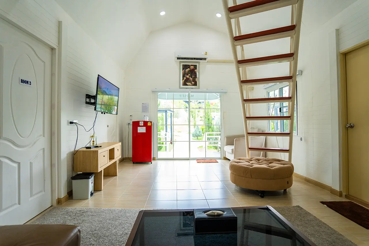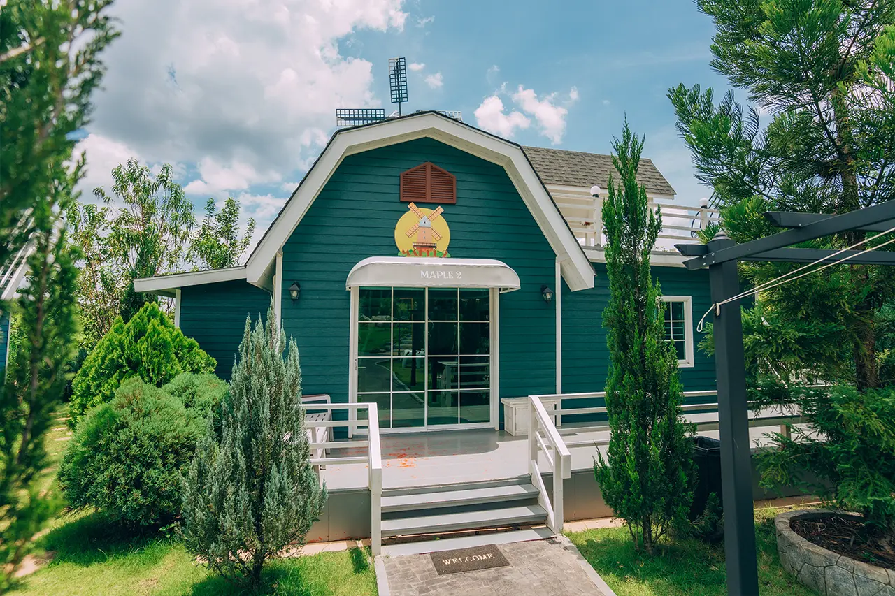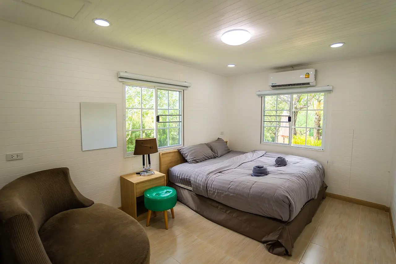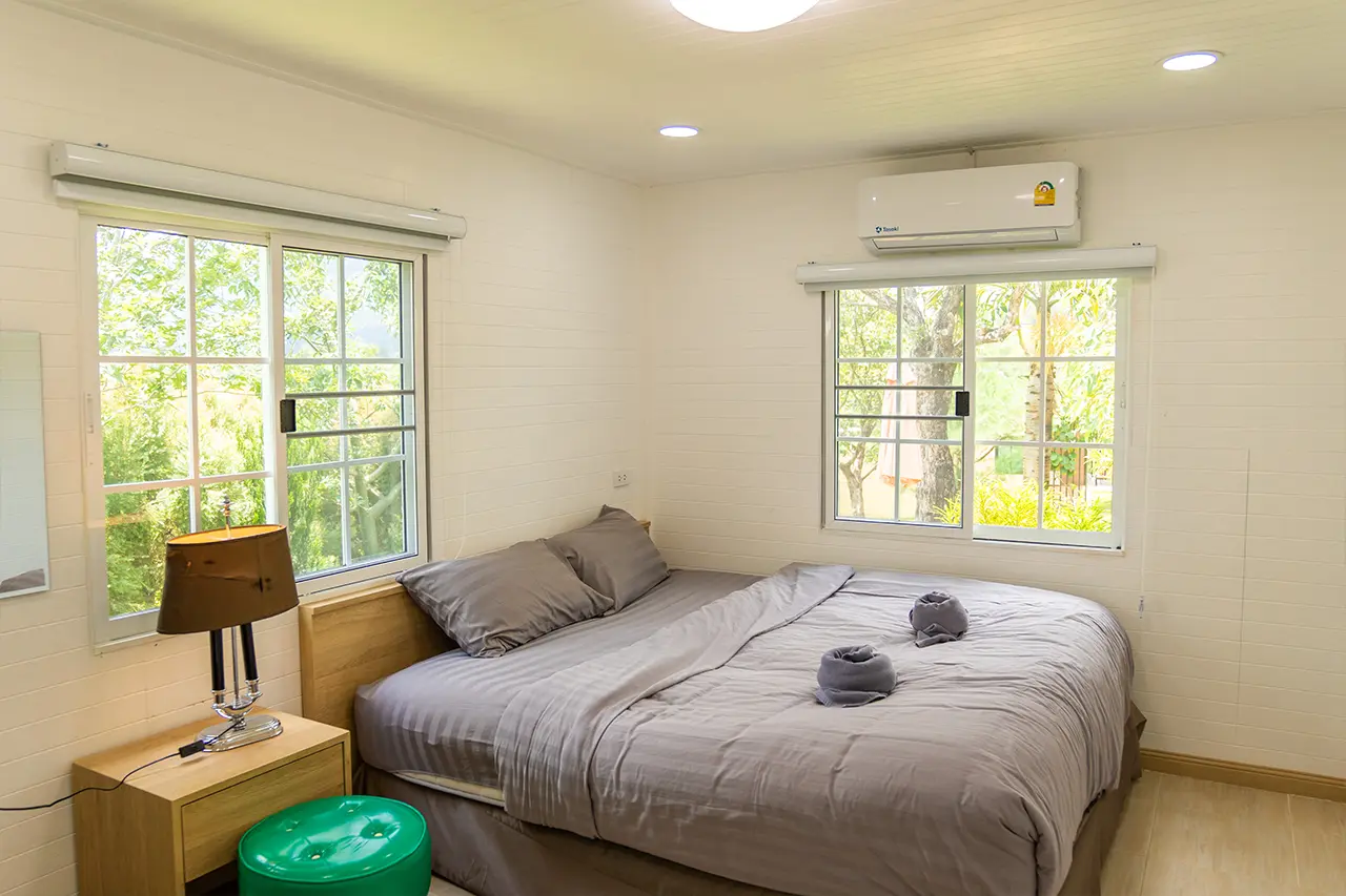 บ้านพักเมเปิ้ล 1-2 มี 2 ห้องนอน 1 ชั้นลอย และ 2 ห้องน้ำ สามารถพักได้ 6 ท่าน/หลัง เสริมได้สูงสุด 3 ท่าน รวม 9 ท่าน เสริมท่านละ 850 บาท (กรณีลูกค้าแจ้งเสริมแล้วไม่สามารถยกเลิกได้ทุกกรณี) ราคาบ้านพักรวมอาหารเช้า เด็กไม่เกิน 8 ปี พักฟรี 3 ท่าน (ไม่มีที่นอนเสริม)