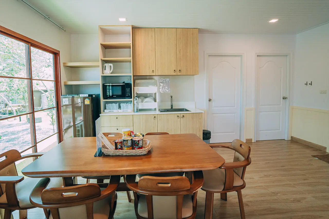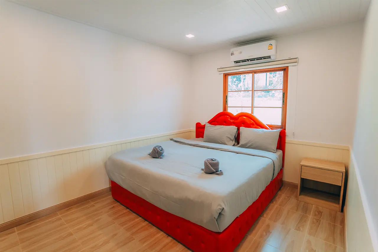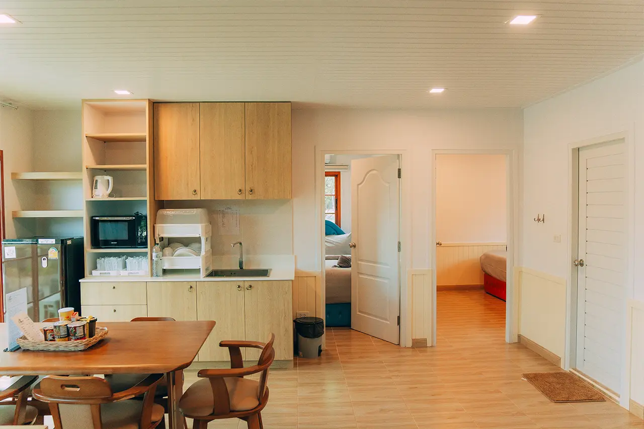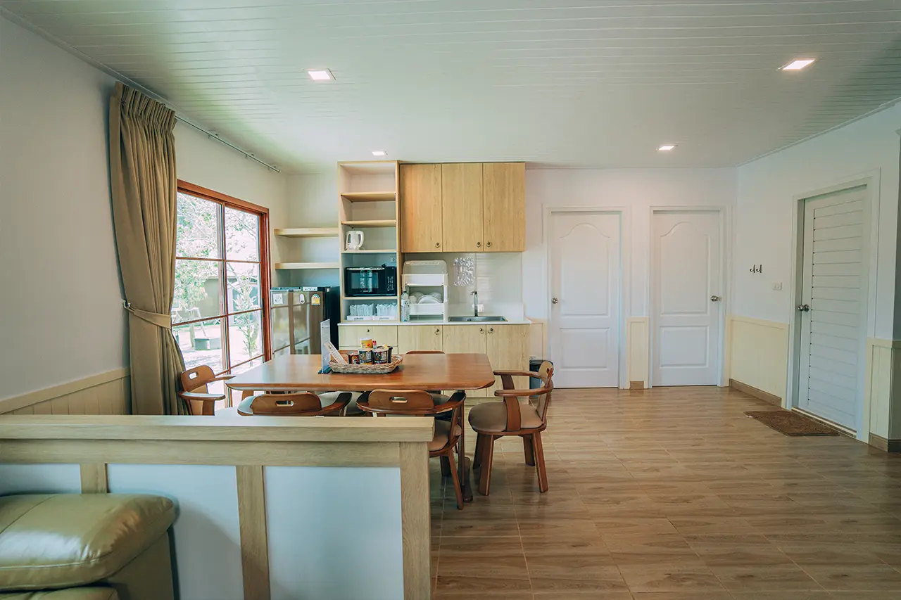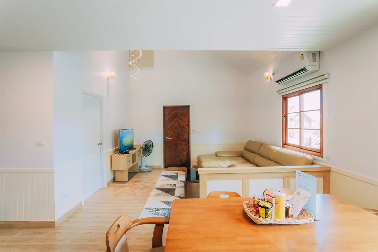 บ้านพักโอลีฟ 1 มี 3 ห้องนอน 1 ชั้นลอย และ 3 ห้องน้ำ สามารถพักได้ 12 ท่าน/หลัง เสริมได้สูงสุด 4 ท่าน รวม 16 ท่าน เสริมท่านละ 850 บาท (กรณีลูกค้าแจ้งเสริมแล้วไม่สามารถยกเลิกได้ทุกกรณี) ราคาบ้านพักรวมอาหารเช้า เด็กไม่เกิน 8 ปี พักฟรี 3 ท่าน (ไม่มีที่นอนเสริม)